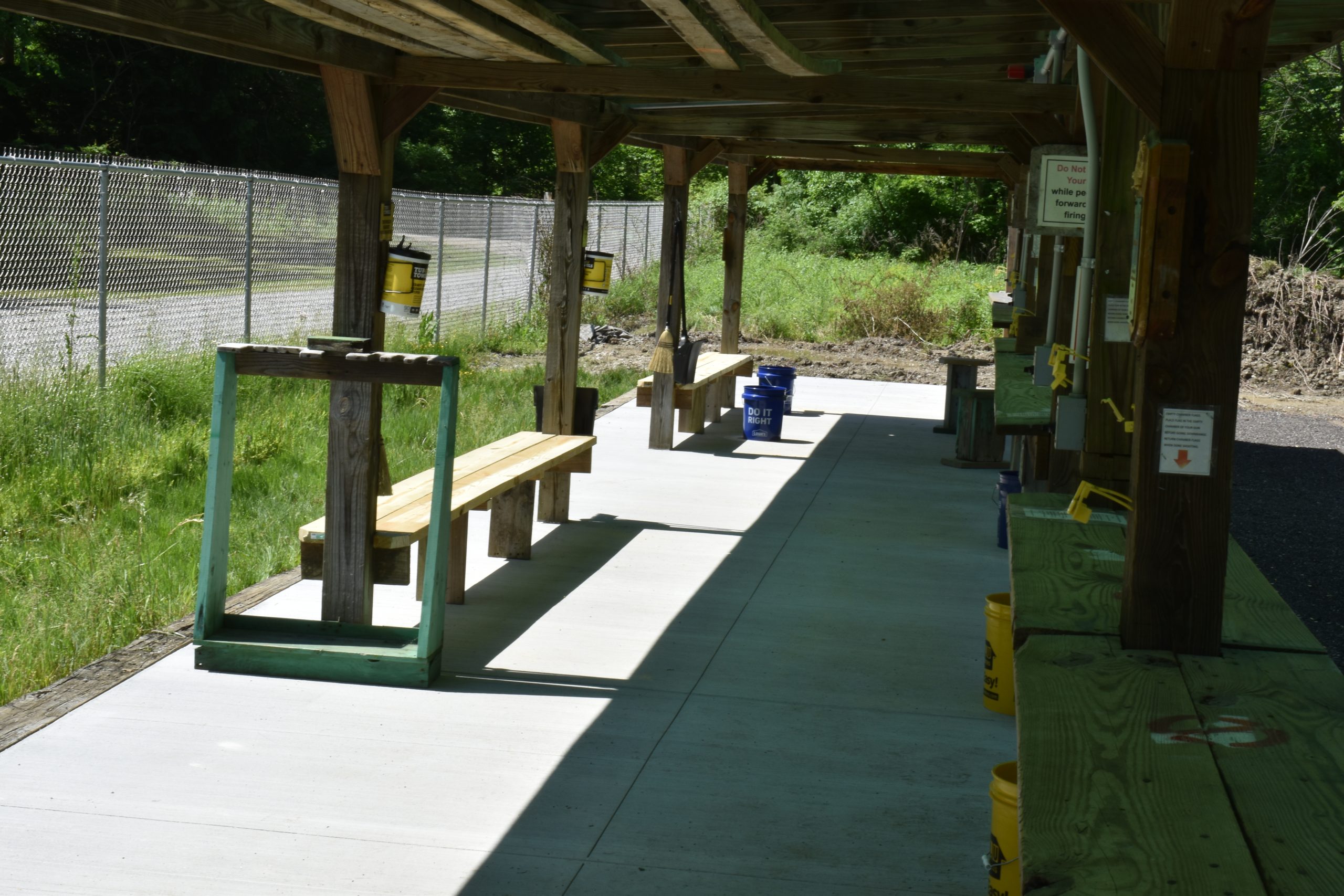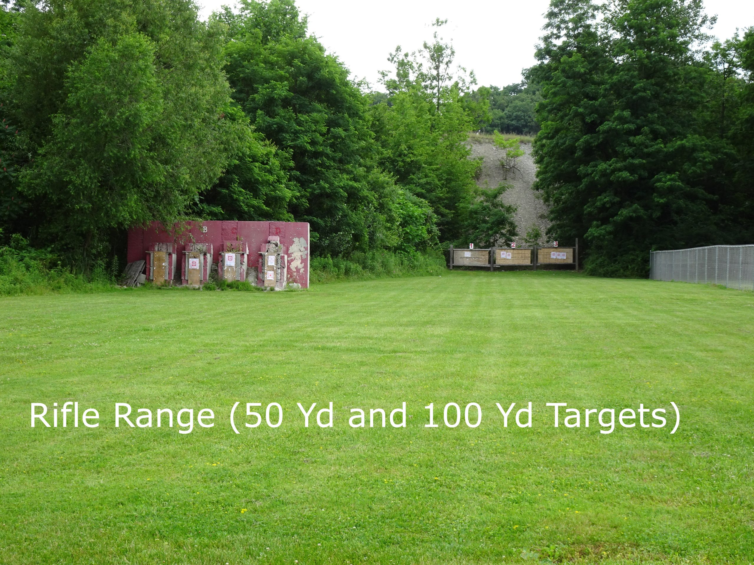 First, below, we have the outdoor rifle range with targets at 50 yards and 100 yards. The rifle range is sheltered and concrete bench rests are provided for the shooters. The rifle range is open under the supervision of a range officer. The hours for the rifle range are posted on the Calendar Of Events page. There is no .50 cal BMG allowed. When the rifle range is open we provide spotting scopes, bench rest devices, bean bags, and targets. Muzzle loaders are welcome on the rifle range.